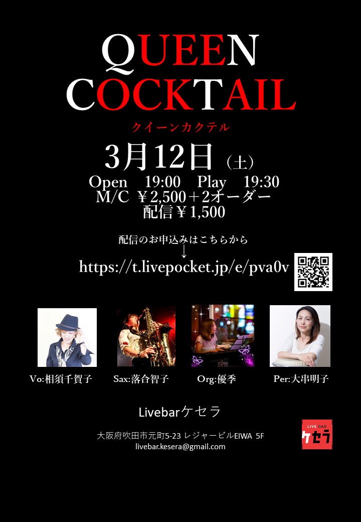 3/12(土) Livebarケセラ 落合智子 優季 相須千賀子 大串明子 チケットの購入はLivePocketで Vo:相須千賀子Sax:落合智子Org:優季Dr:大串明子入り17:00開場18:30開演19:00